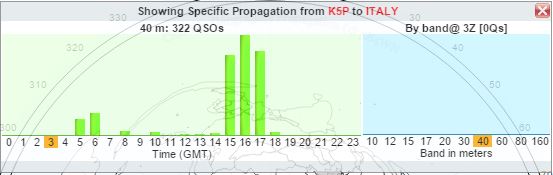 Ci sono infatti dei grafici che per la località scelta danno l’andamento del numero dei QSO per banda nelle varie ore del giorno, anche qui allego un esempio significativo che riguarda Palmyra K5P: dai grafici si vede che le aperture verso l’Europa erano quasi assenti nelle bande alte, decisamente migliori dai 30 mentri in giù seppure limitate a poche ore la mattina presto (5-7) o il pomeriggio (15-17).
